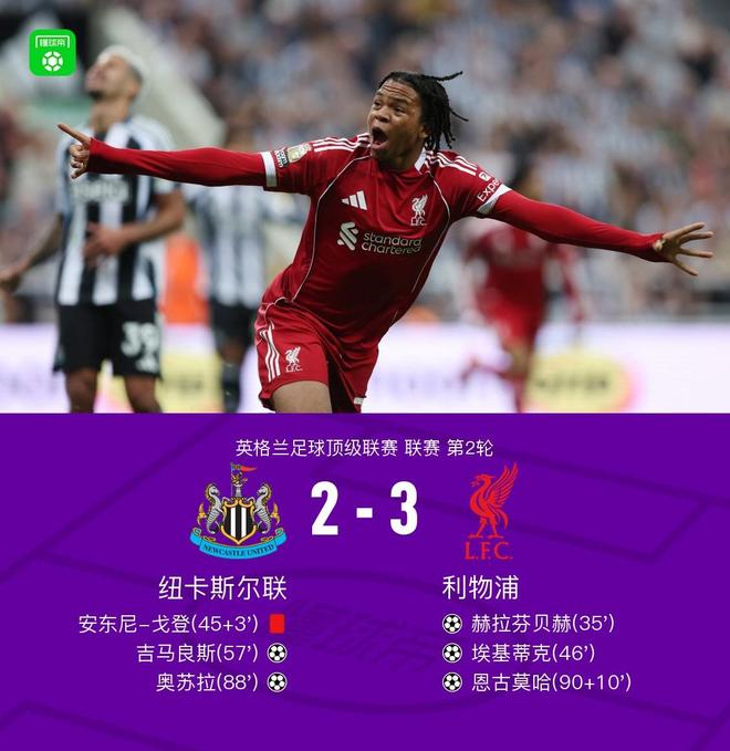 8月26日,在英国足球顶级联赛的第二轮比赛中,利物浦在国内面对纽卡斯尔联队。在比赛的35分钟内,Garkepo提供了帮助,而Heraffenberg为利物浦打了第一笔记。在停止上半场的第三分钟,安东尼·戈登(Anthony Gordon)被派出红牌犯规,纽卡斯尔联队(Newcastle United)并没有受到伤害。改变两侧后,加尔克波(Garkepo)再次提供了帮助,Ekitic推动了球并得分,利物浦扩大了领先优势。在57分钟内,Livrants帮助Guimaraes指出了一个头球,纽卡斯尔联队攻入了进球。在第88分钟,Osula在罚球区以外跑了一段距离,帮助纽卡斯尔联队以2-3的速度赶上。在下半场停止的第10分钟,Tinusalah以得分抓住了Namaha,利物浦终于将比分锁定在3-2。在比赛结束时,利物浦以3-2击败了纽卡斯尔联队。在主赛事的34分钟内,利物浦街区埃德·赫拉芬伯格(Ed Heraffenberg)在前场比赛,并远射了。利物浦以第45分钟和第三分钟领先1-0。戈登飞过铲球范·迪克(Van Dijk)。审查了VAR后,裁判更改了红牌,并在46分钟内将其释放。闪电! Ekitic在推杆中得分,利物浦在纽卡斯尔2-0的第57分钟打进了进球! Guimaraes击败了Kelkez并为头球打分。在第87分钟,纽卡斯尔1-2利物浦,扮演一个较少的球员与分数相结合!奥苏拉(Osura)从教皇(Pope)获得了很长的传球,纽卡斯尔(Newcastle)在利物浦(Liverpool)以2-2的成绩取得了2-2的得分,并在第90和9分钟内独家观看了英超联赛,这是最终谋杀案! 16岁的Namingha在一个非常愉快的时刻以3-2赢得了10名纽卡斯尔球员的进球,以3-2赢得了进球。游戏即将开始。约琳顿几乎踢了加尔基波的头,使他对利物浦球员感到不愉快,持续了7分钟。 Heraffenberg中场反攻击的Guimaraes。裁判在10分钟内显示了一张黄牌。这传奇的纽卡斯尔得分手艾伦·希勒(Alan Shearer)出现在看台上的第13分钟。纽卡斯尔错误地捍卫了背部,威尔兹的枪击事件被教皇独家保存。在第16分钟,埃拉(Ellaa)收到了伴侣的通行证,而三角形的后传票在第20分钟没有随访。 Connatra跌落到戈登。裁判在27分钟内显示了黄牌警告。纽卡斯尔(Newcastle)从侧面进行了十字架,平登(Pingordon)在球之前略高于28分钟。纽卡斯尔在前场上进行了连续的合作,戈登再次抓住了这一点,几乎得分了31分钟。康纳特(Connate)的通行证被打断了,纽卡斯尔(Newcastle)迅速进行了反击,阿里森(Alisson)提早袭击并没收了球34分钟。利物浦挡住了赫拉芬堡在前场的长期射门,利物浦以1-0领先第41分钟,萨拉赫从侧面获得了出色的传球,他的队友并没有从中间的同一位获得第45分钟 +第三分钟的同事。rdon在范迪克(Van Dijk)和范·迪克(Van Dijk),范·迪克(Van Dijk)和范·迪克(Van Dijk),范·迪克(Van Dijk),范·迪克(Van Dijk),范·迪克(Van Dijk)。红牌在第46分钟寄给他,布利茨! Ekitic通过推杆得分。利物浦在54分钟内2-0纽卡斯尔。 Toneali怀疑会使她的凉爽脱落。团队医生进入农场接受治疗57分钟,并赢得了进球! Guimaraes击败Kelkez得分。纽卡斯尔在65分钟内1-2利物浦。舍尔被困在加尔基(Garkebo)的地方,跌落在地面上。裁判没有说在第75分钟,约林顿在哈拉芬贝格的对抗中受伤,然后拉姆齐更换了79分钟。 Ekitic和Werz是替代的,Chiesa和Breaksa的替换为87分钟,Radley将标记与更少的球员结合在一起!奥苏拉(Osura)从教皇获得了很长的传球并得分,纽卡斯尔(Newcastle)在利物浦(Liverpool)的第90和9分钟2-2中得分,这是另一个最后的杀戮! 16岁的恩格莫哈(Engumoha)以3-2的推杆打进了进球赢得前十名纽卡斯尔阵容的技术统计数据[Migu对英超联赛的独家观点]