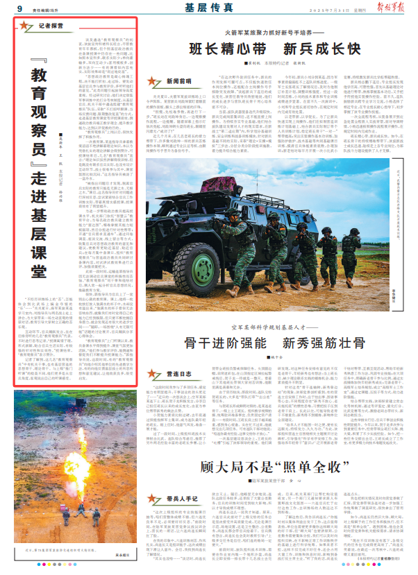 “教育观察者”进入土著教室■Sinian Wang Kai Pla -Sun -day Reporter Sun Xingwei“您如何体验到在比赛领域赢得金牌和银色的乐趣,而无需在对话,教学,教学和指导所有人建立正确和充满希望的人的生活中,以及一些“热情的人”的生活中的“硬性”的实践,以及“坐着”的生活,而“ “教育观察家”,有办公室官员,以及土著人民的营和公司的意识形态和理论主持人。与检查“聆听班级的门”的检查不同,他们客观地表达了从官员和士兵的观点中聆听班级的经历。在谈到最初选择“教育观察家”的意图时,旅的旅部门承认,即使每年进行教育,一些政治老师在准备课程时仍然遇到一些问题,例如阅读许多书籍和与现实的联系更少;更多的单向灌输和更少的双向接触;应用了更多的模板,几乎没有创新技术……有些类似乎充满了内容,但实际效果是“雨后土壤是湿的”。 “意识形态和政治教育是Oneg Heart -Unity项目和灵魂的形成,不应打折或进行动议。基层和士兵应移动参加教育评论并更多地倾听他们的观点。”此类问题引起了旅领导人的极大关注。经过研究和讨论,他们决定从军事训练中的评分和评估系统中学习,从基层官员中选择并组成一个“教育观察者”团队,并组成了一个“教育观察者”团队,由基层官员,士兵,士兵,士兵,士兵,士兵,士兵,士兵,士兵,士兵,士兵,士兵,士兵,士兵,士兵以及士兵还有士兵,士兵,士兵,士兵,士兵,士兵,士兵和士兵组织干部,并采用“不打招呼,跟随课堂,当场反馈,在时间限制内进行反馈和审查”的方法,进入格鲁斯教育课堂评估和教学概念的质量和效率,以纠正他们的教学概念,以提高他们的教学概念。在教育课程中,一位教育班级是无休止的,他认为他会以可靠的理论解释来赞美,但是在讲座之后,许多“教育中的观察者”是无瑕的指出后,我得知教育与官员和士兵的实际状况分开,只能是无色的水和无根的树。”课后,教育工作者深深地反映了这个问题,它被严格地将其与官员和士兵的实际培训,并通过真实的情感和质量的教学和质量良好的教学良好的教学效率,并有效地将其与真正的情感结合起来。为了进一步帮助政治教师提高其教学水平,代理部门依靠“智能云”平台“智能云”来促进每个政治老师的教育能力的“雷达图”,从而准确地了解他们的缺点和弱点,然后为团体提供目标援助;通过问卷,讨论,在线信息等,打开“官员和士兵的直接火车”,以收集意识形态和政治教育的官员和士兵的意见和建议,以便教育是CL奥塞尔(Oser)到土著人,靠近官员和士兵;调整公司的“教育观察者”,屠宰场和公司的政治教师一起讨论了课程准备的内容,评论了讲座的有效性和测试的测试,并增强了控制质量。几个小时前,运输公司的教育工作者郭因无法动员教室中官员和士兵的热情而感到困扰。在“观察者观察者”刘(“教育观察者”)配对之后,两人经常评估官员和士兵的意识形态地位以及对教育计划的思想。很快,郭教练为官员和士兵提供了富有想象力的教育课。在课堂上,他将钢指甲放在装满水的杯子里,但水不会溢出。 “一杯充满水的杯子似乎无法容纳事物,因为我们有时会觉得我们的MGA能力已经达到了极限,但是只要我们继续敲击我们的OWn潜力,我们将看到仍然有很大的改进空间……”因此,关于主题的讨论“人们有分享他们的经验的可能性。因为“教育观察者”是要倾听班级,所以教师的课程准备的水平得到了改善,课堂环境变得更加活跃。 “他们参与教学分析可以强迫并鼓励我们继续提高我们的教学能力。”导师郭说,在这段时间里,一些“教育观察家”向他介绍了其他单位的先进教学方法,有些人是他对土著士兵的思想和观点进行了反馈,使他受到了很多启发并受到了启发。