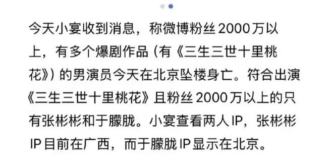 9月11日,坏消息突然传播到娱乐业。圈子里娱乐的名人表明,一个演员在圈子中陷入了他的死,并提供了有关相关当事方的相关信息。根据狗仔队的说法,这位男演员在一个社交平台上拥有超过2000万粉丝,他看来的许多电视连续剧都是“热门”作品,其中之一是“三个世界的三个生命,十英里的桃花花朵”。一位演员张·本宾(Zhang Binbin)和尤门隆(Yu Menglong)在“三个生命中的三个世界十英里的桃花开花”中,超过2000万球迷是演员张·宾宾(Zhang Binbin)和尤·孟隆(Yu Menglong)。根据IP,可以看出张本宾当前的IP位于广西,Yu Menglong在北京。突然的坏消息在整个网络中震惊。尽管网民无法接受,但他们认为他们也是关于跳出建筑物的男演员的身份。毕竟,《娱乐杂志提供的信息》很明显。所以据报道,堕落去世的男演员是孟隆。一些网民在评论区打破了这一消息,称Yu Menglong从北京Chaoyang地区的建筑物中摔下来。不知道具体原因。网民们简直不敢相信Yu Menglong陷入了他的死亡,因此他们打电话给他说话并否认谣言。然后,Yu Menglong的额外话语开始讨论并确认该消息在互联网上是正确的。落入大楼的男演员确实是Yu Menglong,没有办法证明谣言。虽然越来越多的人被教导到孟隆,但公众的意见立即爆炸了,娱乐记者也随机收到了MGA新闻。一名内部人向他暴露了更多细节,并确认从大楼掉下来的男演员是Yu Menglong。从娱乐记者那里,我得知Yu Menglong从北京的一栋建筑物中倒下,去世了,这与网民谈到乔亚湾地区。 9月10日,一名内部人士Yu Menglong与五到六个好朋友在家里宣布。大约在9月11日凌晨2点,Yu Menglong回到房间睡觉并关上门。大约凌晨6点,他的朋友离开了,但没有看到Yu Menglong。每个人都在楼下走,发现了孟伦的尸体。他发现并打电话给警察的一个邻居站起来walk狗。此外,内部人士宣布,Yu Menglong还从他的好朋友口袋里有两个Re -Relo。警方干预了调查,并裁定了刑事案件。特定因素仍在进一步研究中。网民发现,9月10日晚上9:31,Yu Menglong也在他的个人社交帐户中游泳。查看了Yu Menglong视频平台的简短说明,他可以说他的最后一次更新是在7月11日。那天,他发布了一组照片,并添加了“标签-HEAR”的主题。在图片中,Yu Menglong出现了On短面紫色的脸。他坐在河边的篱笆上拍照。在图片中,他帅气,阳光明媚,没有异常。在社交平台上,Yu Menglong的最后一次更新保留在9月3日,此后没有更新更新。 Yu Menglong在1988年是Ipibirthdate,如今已有37岁。作为男演员,这是一个职业发展的时期。他有良好的条件和良好的资源。我真的不知道他为什么无法考虑并选择以一种很好的方式离开。据媒体报道,警方已确定刑事案件,并希望真相将很快审查。