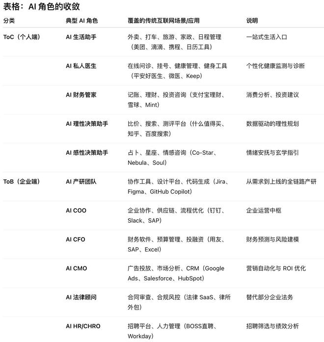 文字| Sun Feng在上一篇文章中,我们提到互联网期间的竞争围绕“思维思维”旋转,而AI竞争正在重返“角色思维”。作为一个新入口,职责不仅可以涵盖许多情况,还可以对用户或企业产生长期的约束力。因此,问题是:AI字符是否永远分裂?答案不是。随着用户需求的积累和业务结构的巩固,AI职责将很快积累在高频和紧急需求的几个主要类别中。 TOC:对于普通用户,尽管六个集成职责的寿命需要复杂,但真正的高频和严格要求确实有限。最后,AI的角色将在消费者方面具有以下ONESD类别:AI助手:更换外卖,出租车,旅行,家庭护理,日程安排管理和其他应用程序,这将成为联合入口。 AI私人医生:进行健康监测,BASIC诊断,慢性疼痛管理和运动计划功能,涵盖在线咨询和健康管理方案。 AI财务经理:担任个人会计师和投资顾问,负责消费审查,财务建议和投资计划。 AI理性的决策助理:基于数据和逻辑,它为用户提供了消费选择,研究计划和职业路径建议,并取代了有效性,评估和问答平台。 AI敏感的决策:情感需求可以满足n含有的精神营养,从心理融合到十二生肖,并提供“非理性”的决策 - 制定支持。 AI学习/成长伙伴(潜在的扩展):为教育和自我完善提供长期整合和实践。这些论文几乎涵盖了个人生活的各个方面。剂量用户将来不需要两次不同的应用程序,但仅依靠某些AI Characte与他们在一起很长时间的RS。人工智能助手将是未来最重要的过剩入口。这不是一个单一场景的工具,而是一个带来所有用户生活和工作的单个接口。该条目的竞争出现在两个主要的硬件和软件营地中:硬件制造商期待通过手机,可穿戴设备和智能家居使用Tiesok;尽管软件制造商依靠大型模型直接在云中提供无处不在的助手服务。但是最终获胜的人很可能是由Openai代表的软件公司的大型型号。有三个因素:首先,入口核心是理解和生成,其依赖于算法和数据积累而不是硬件形式。其次,该软件具有更大的迭代速度和跨平台功能,并且可以快速覆盖不同的终端,而硬件受产品周期和生态障碍的限制;第三,t他的多雨价值在认知层和内容层中,用户确实依靠谁理解自己是最好的,而不是他们拥有哪种设备。这类似于移动互联网时期的逻辑:几乎所有手机制造商都制作了信息产品,但是那些可以使Tutout和Doulin等超级进入的人最终都是软件公司。 AI期间的比赛也将重复此场景。 TOB:与数字员工相比,虚拟高管具有更“有组织的”场景方向。企业功能已变得高度分歧,AI角色趋势直接在主要业务位置。 AI生产和研究团队:不仅是单个产品经理,而且是产品,设计和工程的虚拟组合。从需求审查,原型设计到代码的生成和发射,都实现了完整的封闭生产和研究循环。 AI COO:负责N的运行例如,核心,优化供应链计划,改善跨部门合作并实时监控项目开发。 AI CFO:企业的“数字财务官”,该企业提供了现金流,预算分配,风险警告和融资建模的预测。 AI CMO:聪明的营销官员会自动开发市场技术,提供广告预算,并且ROI将能够实时优化。 AI法律顾问:Upang Mahawakan Ang Pagsusuri Sa Kontrata,Kontrol sa Peligro ng Pagsunod在Babala Sa Paglilitis的Para sa Mga negosyo,Pagpapalit Ng Ilang Mga Kumpanya kumpanya ng Batas,Ligal na SaaS的Batas。 AI HR/CHRO:负责招聘筛查,绩效管理和培训计划,并协助管理人力资源。这些论文几乎组成了虚拟公司管理团队:生产和研究经营金融市场 - 法律人类,完整而系统。从分裂到转换AI D的进化路径UTIE经常以自己的方式开花,然后逐渐联系:最终,TOC发展了六个同伴,涵盖了生活,健康,财务和理性/感知决策。 TOB将建立一个虚拟企业管理团队,该团队与操作的主要部门直接匹配。它显示了两个政策:用户和企业不想被无尽的AI片段打扰,但是它需要一些稳定且可靠的关键角色。只有高频和紧急需求才能长期履行长期职责,而侧面需求则相结合或解散。结论互联网期间的入口是场景,AI期间的入口是Ang纸。随之而来的是,正常化角色的角色正在出现:用户很长一段时间内只有几个AIS,并且企业将逐渐拥有一个完整的虚拟管理层。将来,竞争不会是该应用具有更多功能,而是AI的角色更可靠和不可替代。